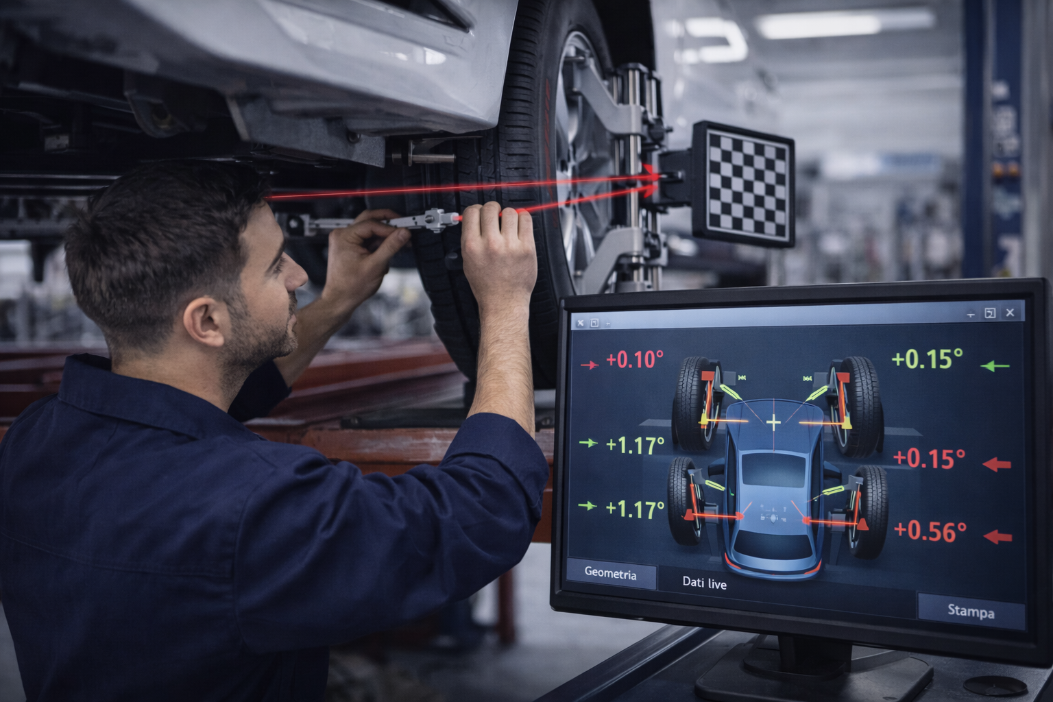 Sul monitor visualizziamo lo stato attuale dell’assetto: valori fuori range evidenziati in rosso, valori corretti in verde. Interveniamo sulle regolazioni meccaniche (tiranti, braccetti) fino a riportare tutto nei parametri previsti dal costruttore.