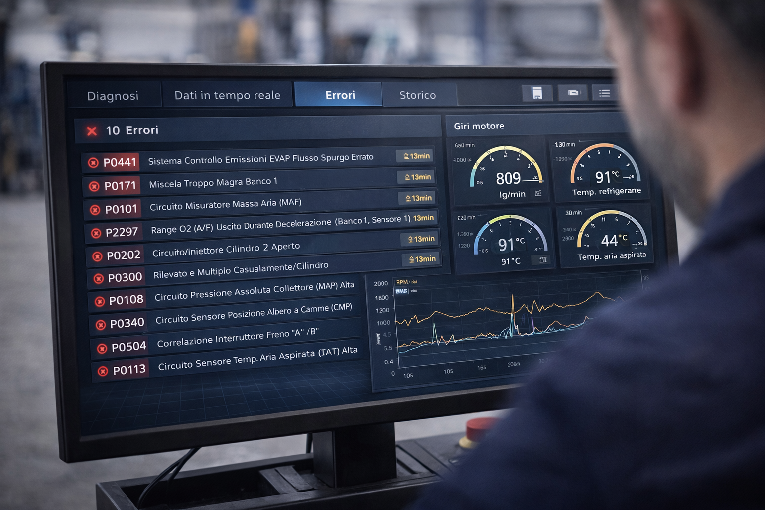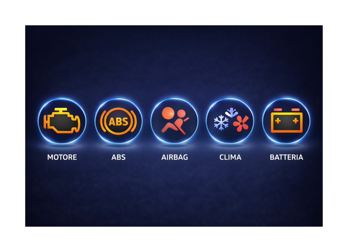 Una spia accesa sul cruscotto può indicare decine di problemi diversi. Con la diagnosi elettronica colleghiamo il nostro strumento alla centralina del veicolo e leggiamo i codici errore memorizzati: sappiamo esattamente cosa non funziona, senza procedere per tentativi.